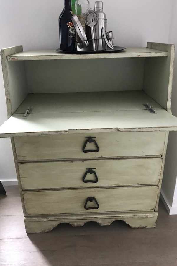 We have received an old white secretaire with darkened paint and wood. It had three drawers at the bottom and some small drawers at the top. The customer wanted to transform and renovate it into a rustic wine cabinet. The wood overall was in a descent condition, and we fully supported his idea.