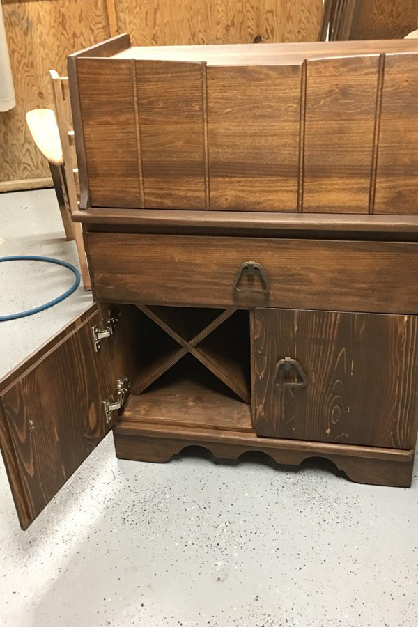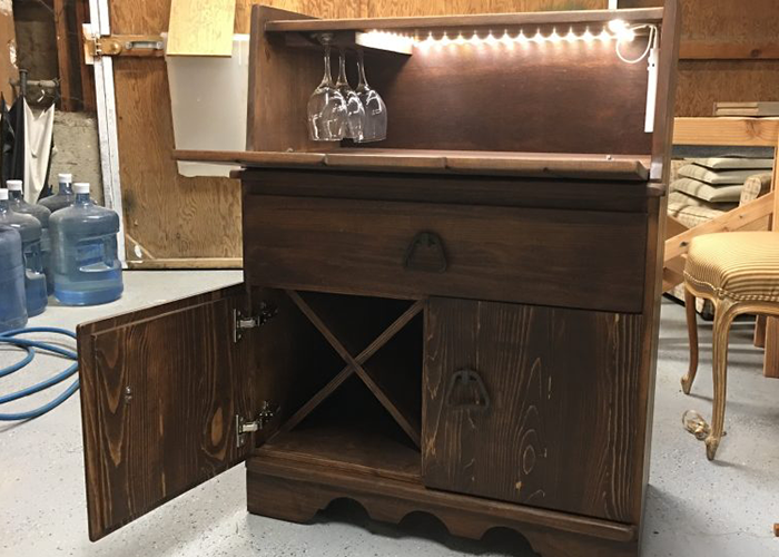We spent almost a month on this project, it was challenging yet interesting. At first, we removed all old paint and the drawers. Our carpenter carefully made a plan of how it should look like (this is the most difficult part, he made sure that everything would look beautiful and fit). Then, he made brand new wooden doors and special wooden shelves for wine bottles for the bottom of the cabinet. As for the top, he crafted special wooden hangers for the glasses. We also put the light that would turn on when the top is open. After that we sanded everything very evenly, so the wood started to play, put the stain to fit the room, and sealed it. The wine cabinet started looking like brand new.
